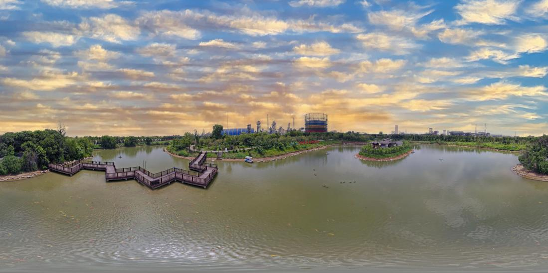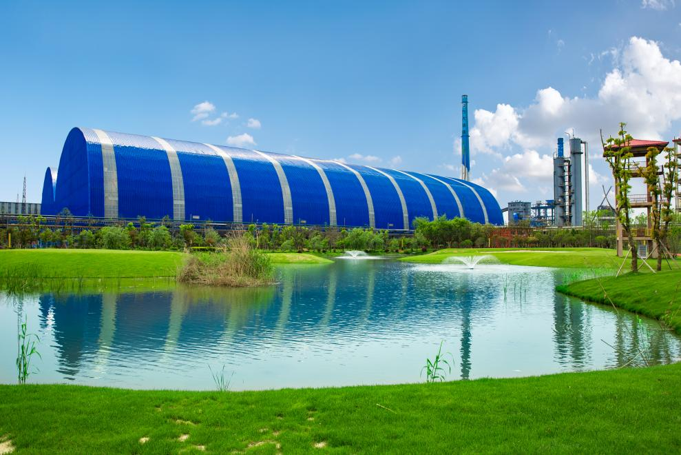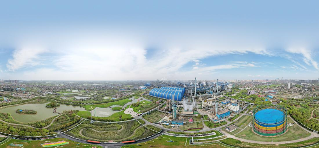 棲身于藍天、綠叢中的焦化廠封閉式料場大棚與煤氣氣柜 張宇亮 攝