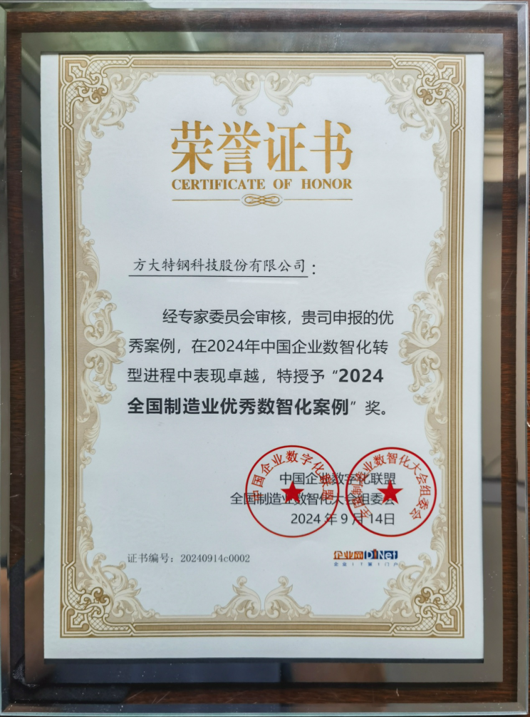 方大特鋼實施的“5G+智慧工廠”項目,斬獲“2024全國制造業優秀數智化案例”獎