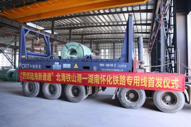 在投產典禮上,還見證了“西部陸海新通道”北海鐵山港至湖南懷化鐵路專用線的首發儀式,卓輝公司首批磨砂卷從北海鐵山港通過鐵路運輸首發發往湖南懷化市場,這將進一步增強西部與中部地區的交通連接。
