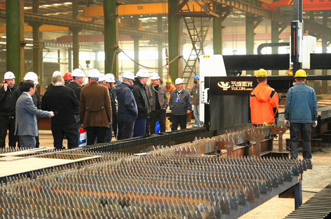 ▲會議代表考察雙工位H型鋼激光切割生產(chǎn)線