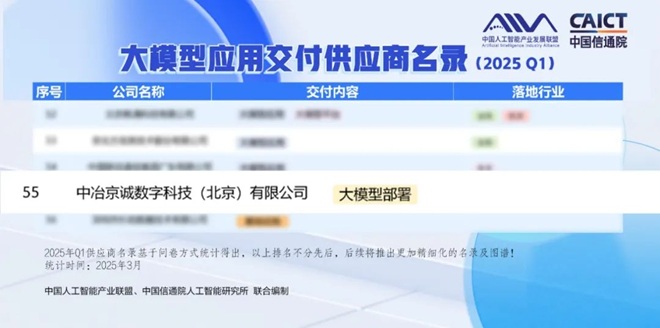 近日,中國人工智能產業發展聯盟(AIIA)與中國信息通信研究院聯合發布《大模型應用交付供應商名錄(2025年Q1)》。中冶京誠數字科技(北京)有限公司(以下簡稱“中冶京誠數科公司”)成功入選,標志著該公司在AI技術與工業場景深度融合領域再獲國家級權威認可。
