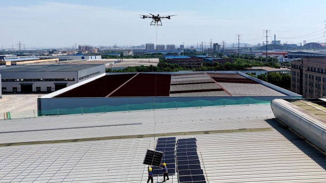 “單架無(wú)人機(jī)每小時(shí)可完成近50塊光伏組件的精準(zhǔn)吊運(yùn)安裝,施工效率較人工提升超5倍?!比涨?,在中國(guó)資環(huán)歐冶鏈金所屬企業(yè)馬鋼利華當(dāng)涂中心基地,無(wú)人機(jī)吊運(yùn)安裝光伏組件的場(chǎng)景成為一道獨(dú)特風(fēng)景,該項(xiàng)目負(fù)責(zé)人介紹,數(shù)架搭載光伏組件的無(wú)人機(jī)穿梭于17000平方米的廠房屋頂,推動(dòng)1.5MW屋頂分布式光伏電站項(xiàng)目建設(shè)步入“快車道”。