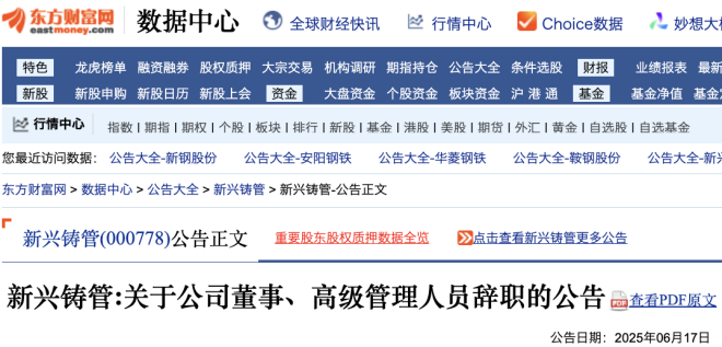 其中顯示,新興鑄管股份有限公司(以下簡稱“該公司”)董事會于 2025 年 6 月 13 日收到該公司董事、總經理劉濤先生的書面辭職報告,劉濤先生因工作原因申請辭去該公司董事、戰略委員會委員、總經理職務。劉濤先生辭職后,不再擔任該公司任何職務。