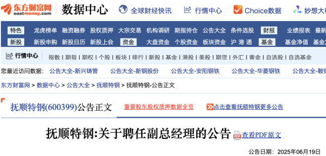 6月19日,撫順特鋼發布《撫順特殊鋼股份有限公司關于聘任副總經理的公告》。