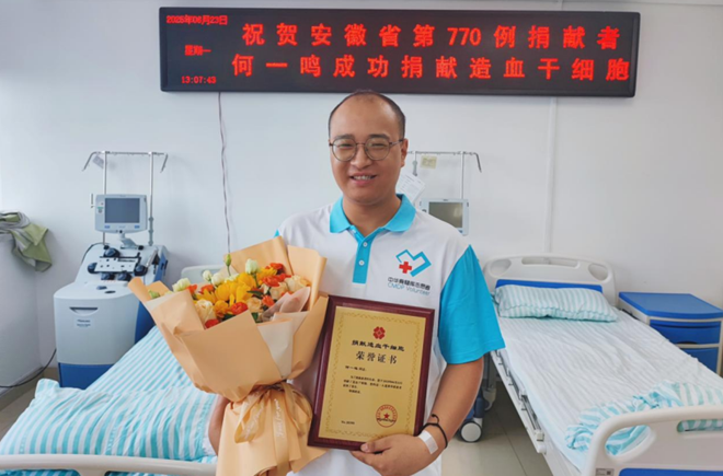 6月18日,何一鳴順利赴合肥入院,為造血干細(xì)胞捐獻(xiàn)做最后準(zhǔn)備。在完成為期5天9次的骨髓動員劑注射后,6月23日上午,他成功捐獻(xiàn)造血干細(xì)胞,成為中華骨髓庫第20399例,安徽省第770例,池州市貴池區(qū)第6例,上海寶冶鋼構(gòu)第1例非血緣造血干細(xì)胞捐獻(xiàn)者,為患者重燃生命之光。