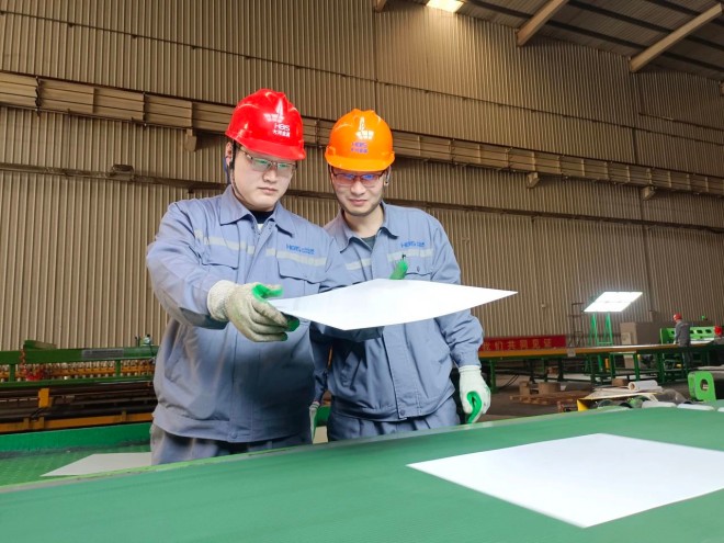 圖為河鋼集團大河金屬質(zhì)檢人員正在檢查家電板產(chǎn)線產(chǎn)品質(zhì)量。