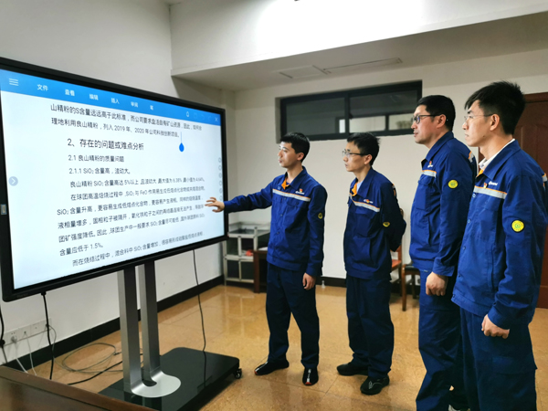 圖為新鋼質(zhì)量管理室的青年科技研發(fā)團隊成員正在探討降本增效工作方法。