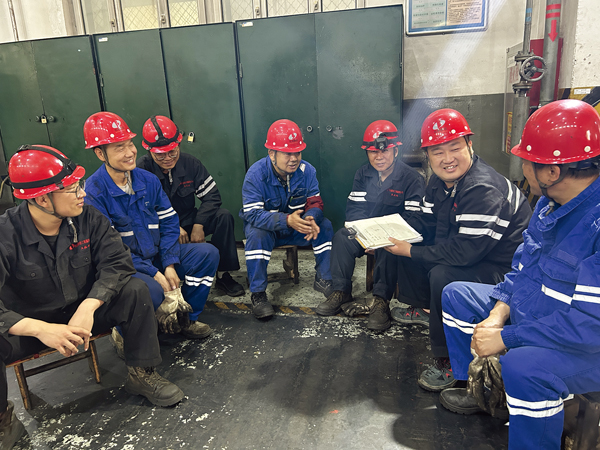 圖為工余時間,班組部分成員聚在一起研討火車頭修理最佳方案。