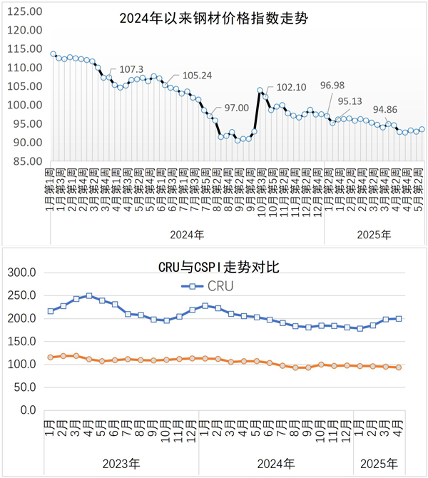 當(dāng)周,中國(guó)鋼材價(jià)格指數(shù)(CSPI)為93.45點(diǎn),周環(huán)比上漲0.64點(diǎn),漲幅為0.69%;比上月末上漲0.29點(diǎn),漲幅為0.31%;比去年底下降4.02點(diǎn),降幅為4.12%;同比下降12.79點(diǎn),降幅為12.04%。其中,長(zhǎng)材價(jià)格指數(shù)為95.67點(diǎn),周環(huán)比上漲0.73點(diǎn),漲幅為0.77%;比上月末上漲0.58點(diǎn),漲幅為0.61%;比去年底下降4.55點(diǎn),降幅為4.54%;同比下降13.96點(diǎn),降幅為12.73%。板材價(jià)格指數(shù)為91.60點(diǎn),周環(huán)比上漲0.62點(diǎn),漲幅為0.68%;比上月末上漲0.15點(diǎn),漲幅為0.16%;比去年底下降3.95點(diǎn),降幅為4.13%;同比下降12.37點(diǎn),降幅為11.90%。