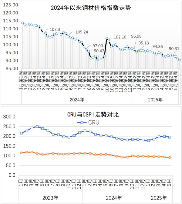 當周,中國鋼材價格指數(CSPI)為90.31點,周環比下降0.49點,降幅為0.54%;比上月末下降0.49點,降幅為0.54%;比去年底下降7.16點,降幅為7.35%;同比下降14.93點,降幅為14.19%。其中,長材價格指數為91.99點,周環比下降0.31點,降幅為0.34%;比上月末下降0.31點,降幅為0.34%;比去年底下降8.23點,降幅為8.21%;同比下降16.11點,降幅為14.90%。板材價格指數為88.58點,周環比下降0.61點,降幅為0.69%;比上月末下降0.61點,降幅為0.69%;比去年底下降6.97點,降幅為7.29%;同比下降14.67點,降幅為14.21%。