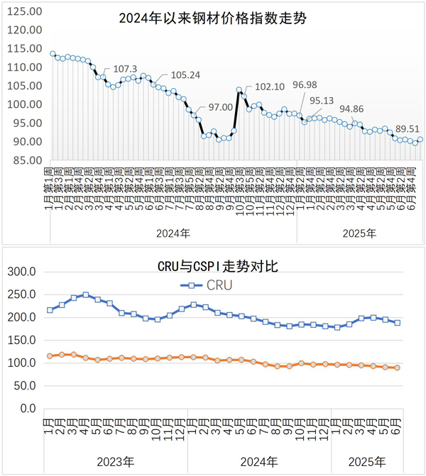 從國際市場來看,6月份,CRU國際鋼材價格指數為188.1點,環比下降7.0點,降幅為3.6%;比去年底上漲7.5點,漲幅為4.2%;同比下降9.4點,降幅為4.8%。其中,CRU長材價格指數為194.2點,環比下降1.4點,降幅為0.7%;比去年底下降2.0點,降幅為1.0%;同比下降10.9點,降幅為5.3%。CRU板材價格指數為184.8點,環比下降10.1點,降幅為5.2%;比去年底上漲12.0點,漲幅為6.9%;同比下降8.9點,降幅為4.6%。分地區來看,6月份,北美地區鋼材價格指數為235.1點,環比下降9.9點,降幅為4.0%;同比上漲9.3點,漲幅為4.1%;歐洲地區鋼材價格指數為212.9點,環比下降10.1點,降幅為4.5%;同比下降1.6點,降幅為0.7%;亞洲地區鋼材價格指數為146.7點,環比下降3.7點,降幅為2.5%;同比下降24.7點,降幅為14.4%。