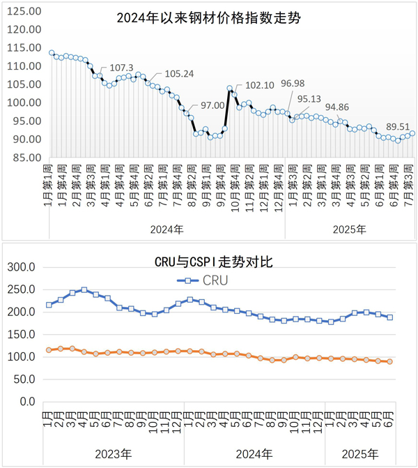 當周,中國鋼材價格指數(CSPI)為91.55點,周環比上漲0.72點,漲幅為0.80%;比上月末上漲2.04點,漲幅為2.28%;比去年底下降5.92點,降幅為6.07%;同比下降9.81點,降幅為9.68%。其中,長材價格指數為93.57點,周環比上漲0.54點,漲幅為0.58%;比上月末上漲2.30點,漲幅為2.52%;比去年底下降6.65點,降幅為6.64%;同比下降9.91點,降幅為9.58%。板材價格指數為89.83點,周環比上漲0.88點,漲幅為0.99%;比上月末上漲2.07點,漲幅為2.36%;比去年底下降5.72點,降幅為5.99%;同比下降9.87點,降幅為9.90%。