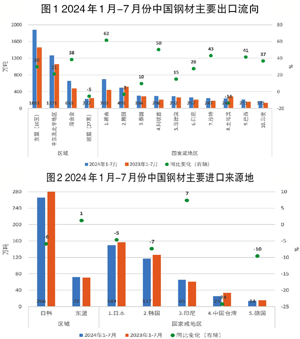 7月份,我國對多數(shù)國家出口環(huán)比回落,其中對越南、土耳其降幅最為顯著;對泰國和巴西出口有所增長。1月—7月份,我國對東盟出口1881.4萬噸,同比增長29.8%,其中對越南出口699.9萬噸,同比增長61.5%;對海合會國家出口652.8萬噸,同比增長38.5%,其中對阿聯(lián)酋、沙特出口量同比增長50.2%、43.1%。