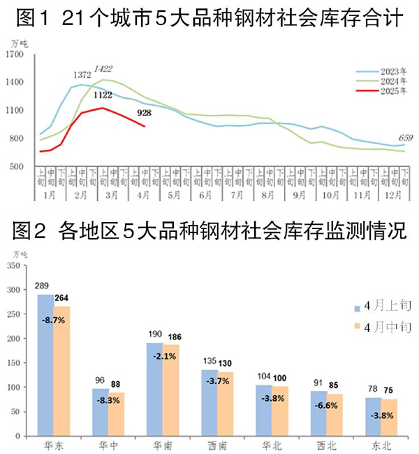 4月中旬,21個城市5大品種鋼材社會庫存為928萬噸,環比減少55萬噸,下降5.6%,庫存連續下降;比今年初增加269萬噸,上升40.8%;比上年同期減少309萬噸,下降25.0%。