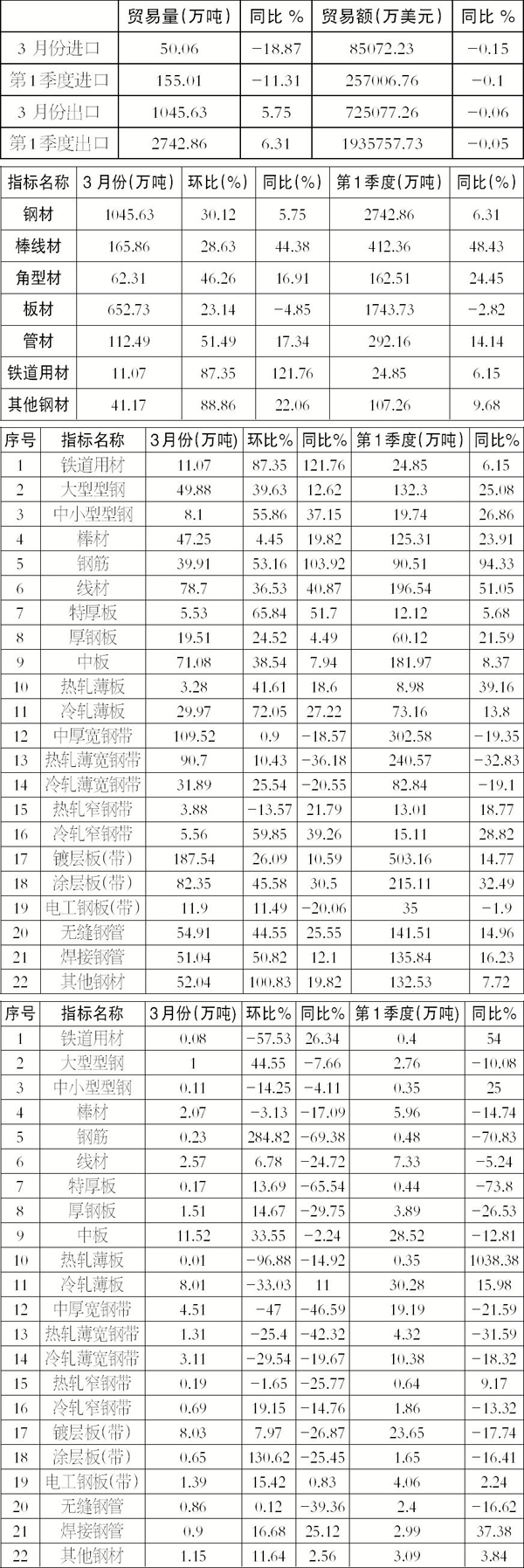 出口方面,第1季度,鋼材出口量達到2743萬噸,同比增加162.9萬噸、增幅為6.3%,出口均價為705.7美元/噸、同比下跌10.5%;鋼坯出口量為257萬噸,同比增加200萬噸、增幅為353.8%;粗鋼凈出口量為2913萬噸,同比增加452萬噸、增幅為18.4%。3月份,鋼材出口量為1046萬噸,同比增加56萬噸、增幅為5.7%,出口均價為693.5美元/噸,同比跌幅為11.5%。