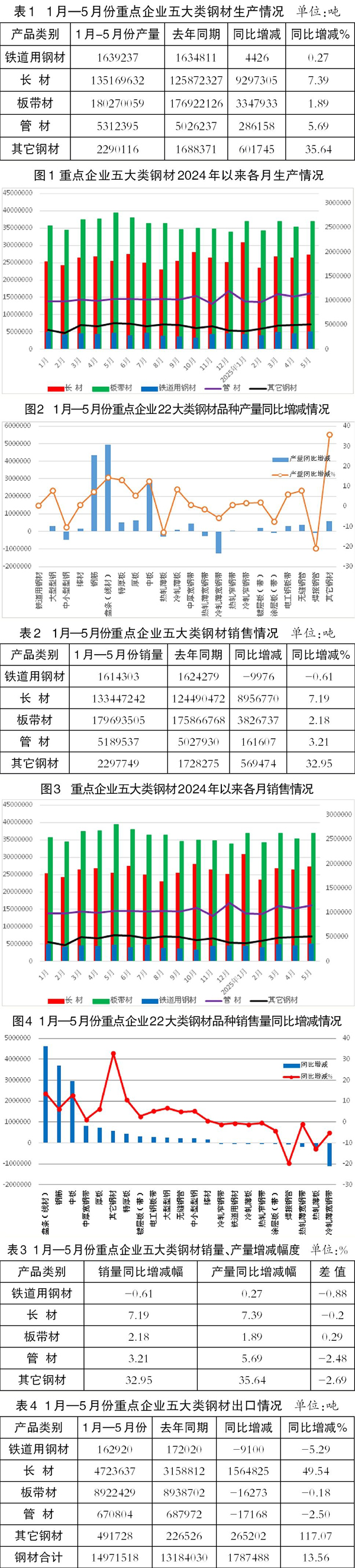 1月—5月份,重點企業銷售的22大類品種鋼材,盤條(線材)、鋼筋、中板、中厚寬鋼帶、厚板、其它鋼材、特厚板、鍍層板(帶)、電工鋼板帶、大型型鋼、無縫鋼管、中小型型鋼、棒材等13個品種銷售量同比增加,冷軋薄寬鋼帶、熱軋薄板、熱軋薄寬鋼帶、焊接鋼管、涂層板(帶)、熱軋窄鋼帶、冷軋薄板、鐵道用鋼材、冷軋窄鋼帶等9個品種銷售量同比減少。