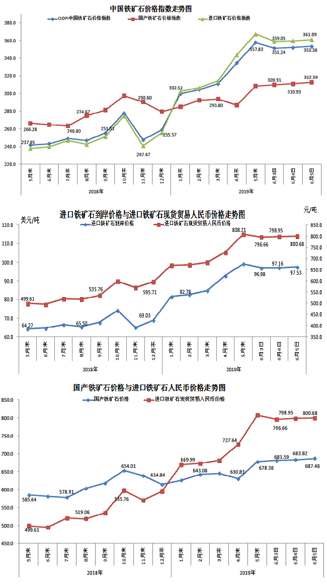 6月5日,中國鐵礦石價格指數(CIOPI)為353.38點,環比上升1.42點,升幅為0.40%。其中,國產鐵礦石價格指數為312.59點,環比上升1.66點,升幅為0.53%;進口鐵礦石價格指數為361.09點,環比上升1.37點,升幅為0.38%。