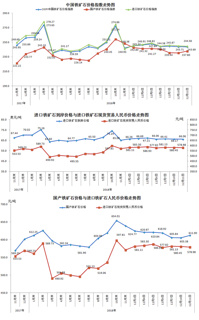 12月11日,中國鐵礦石價(jià)格指數(shù)(CIOPI)243.69點(diǎn),環(huán)比下降0.02點(diǎn),降幅為0.01%。其中:國產(chǎn)鐵礦石價(jià)格指數(shù)為237.80點(diǎn),環(huán)比上升2.53點(diǎn),升幅為1.08%;進(jìn)口鐵礦石價(jià)格指數(shù)為244.58點(diǎn),環(huán)比下降0.41點(diǎn),降幅為0.17%。