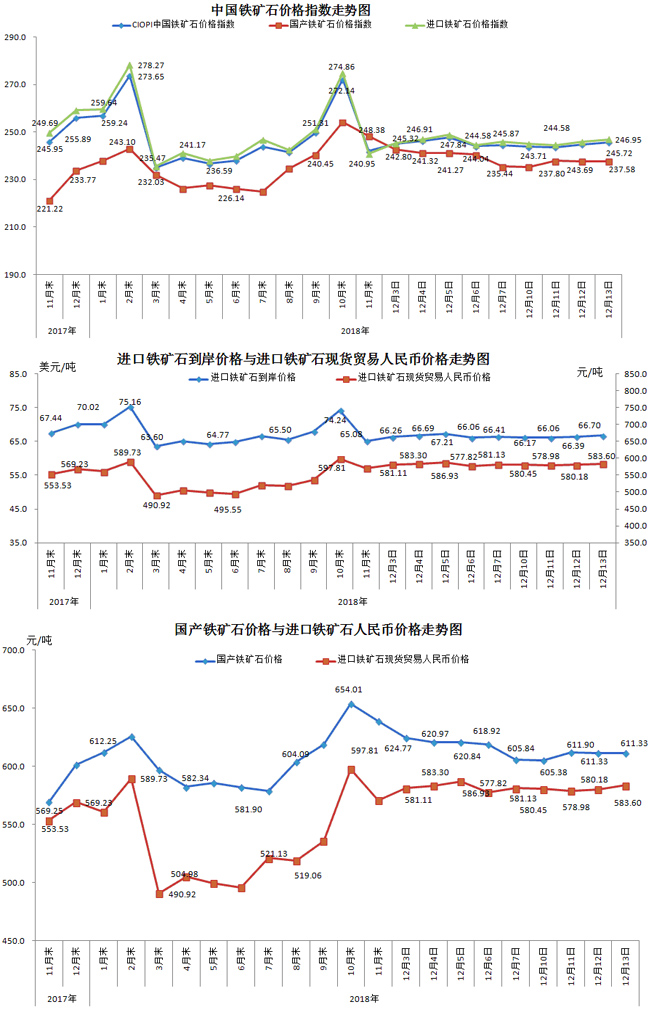 12月13日,中國鐵礦石價格指數(CIOPI)245.72點,環比上升1.00點,升幅為0.41%。其中:國產鐵礦石價格指數為237.58點,環比持平;進口鐵礦石價格指數為246.95點,環比上升1.15點,升幅為0.47%。