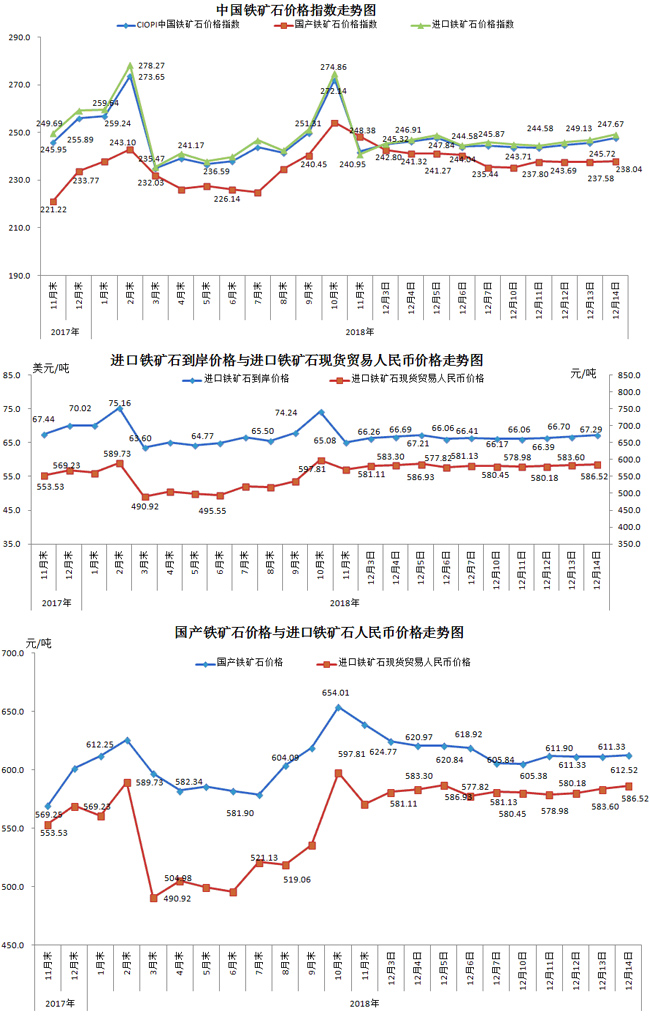 12月14日,中國鐵礦石價(jià)格指數(shù)(CIOPI)247.67點(diǎn),環(huán)比上升1.96點(diǎn),升幅為0.80%。其中:國產(chǎn)鐵礦石價(jià)格指數(shù)為238.04點(diǎn),環(huán)比上升0.46點(diǎn),升幅為0.19%;進(jìn)口鐵礦石價(jià)格指數(shù)為249.13點(diǎn),環(huán)比上升2.18點(diǎn),升幅為0.88%。