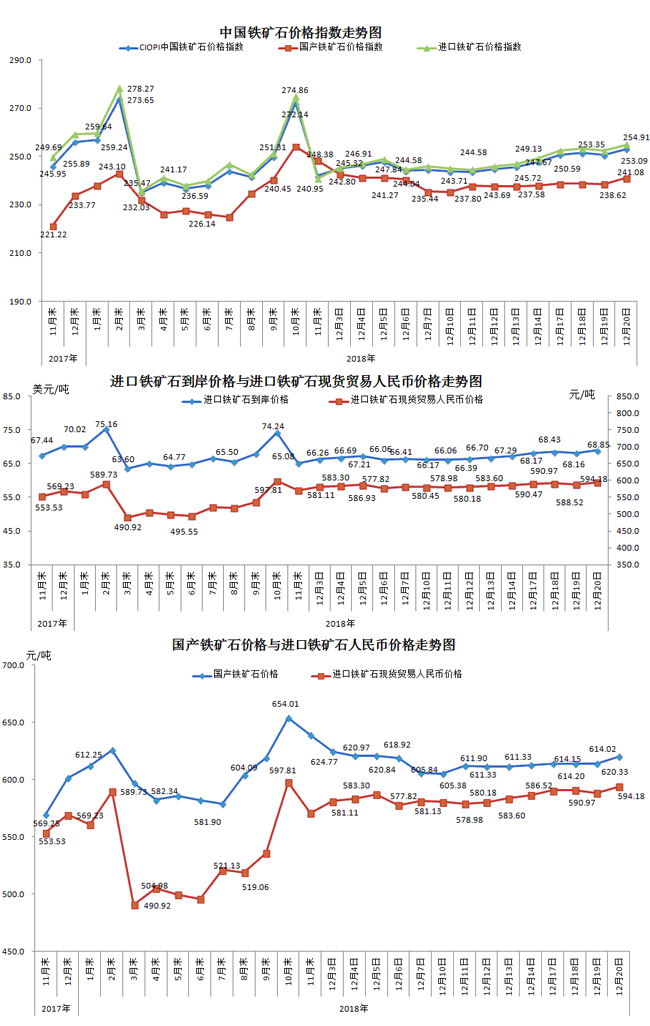 12月20日,中國鐵礦石價格指數(CIOPI)253.09點,環比上升2.54點,升幅為1.01%。其中:國產鐵礦石價格指數為241.08點,環比上升2.45點,升幅為1.03%;進口鐵礦石價格指數為254.91點,環比上升2.55點,升幅為1.01%。