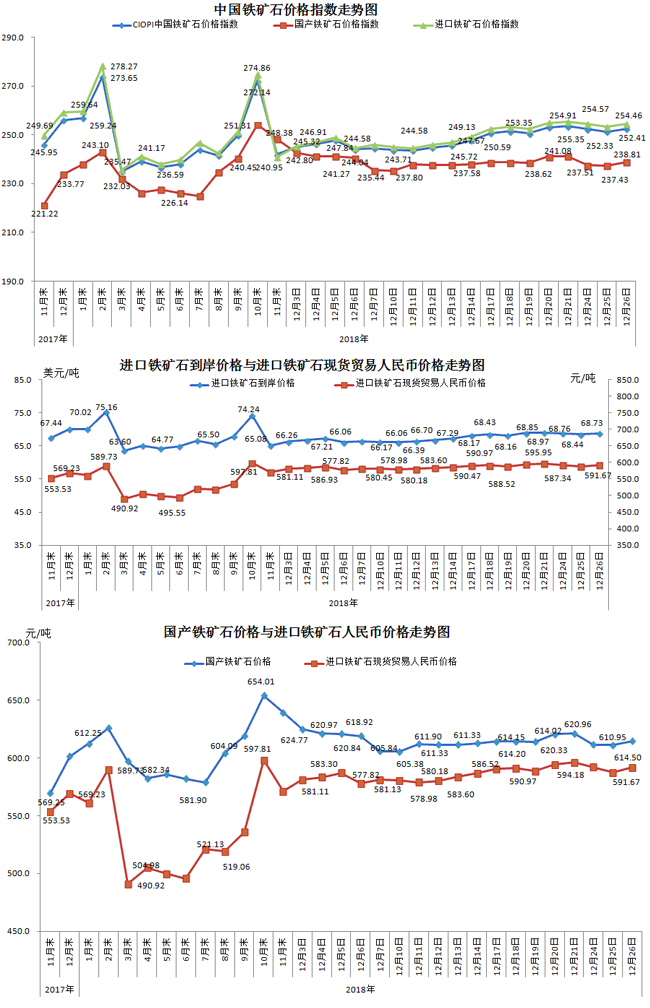 12月26日,中國鐵礦石價格指數(CIOPI)252.41點,環比上升1.11點,升幅為0.44%。其中:國產鐵礦石價格指數為238.81點,環比上升1.38點,升幅為0.58%;進口鐵礦石價格指數為254.46點,環比上升1.07點,升幅為0.42%。