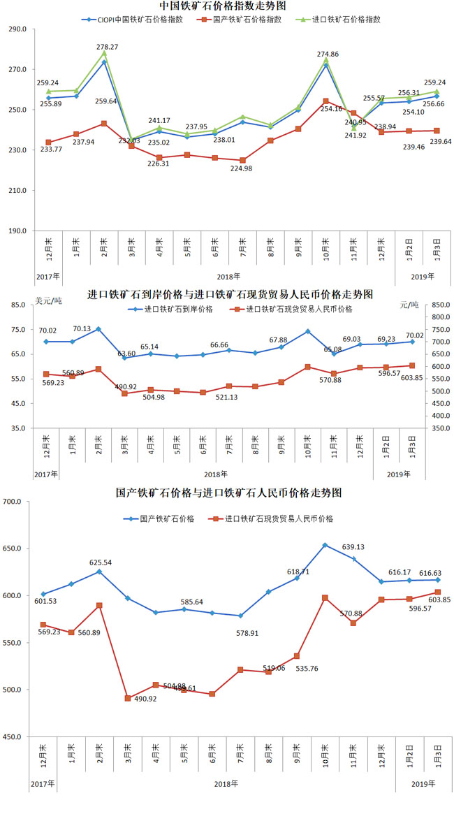 1月3日,中國鐵礦石價格指數(shù)(CIOPI)256.66點,環(huán)比上升2.56點,升幅為1.01%。其中:國產(chǎn)鐵礦石價格指數(shù)為239.64點,環(huán)比上升0.18點,升幅為0.07%;進口鐵礦石價格指數(shù)為259.24點,環(huán)比上升2.92點,升幅為1.14%。