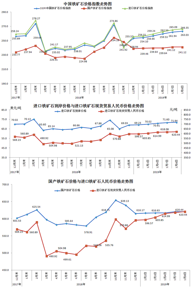 1月8日,中國鐵礦石價格指數(CIOPI)263.03點,環比上升1.09點,升幅為0.42%。其中:國產鐵礦石價格指數為241.12點,環比持平;進口鐵礦石價格指數為266.35點,環比上升1.26點,升幅為0.47%。