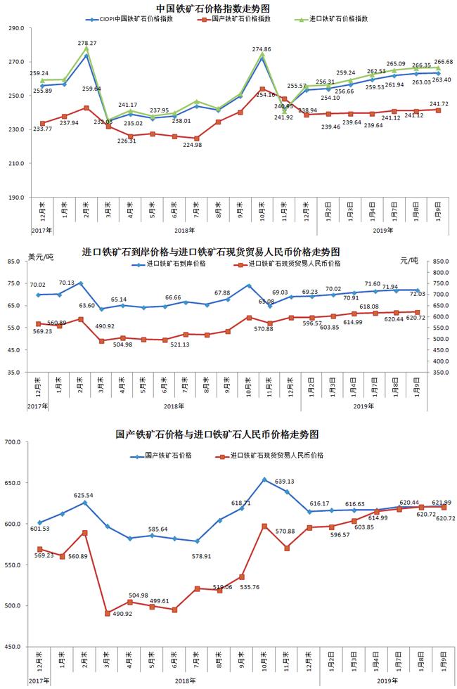 1月9日,現貨貿易進口鐵礦石62%品位干基粉礦人民幣含稅價格為620.72元/噸,環比每噸上升0.28元,升幅為0.05%,當月平均價格為612.44元/噸。