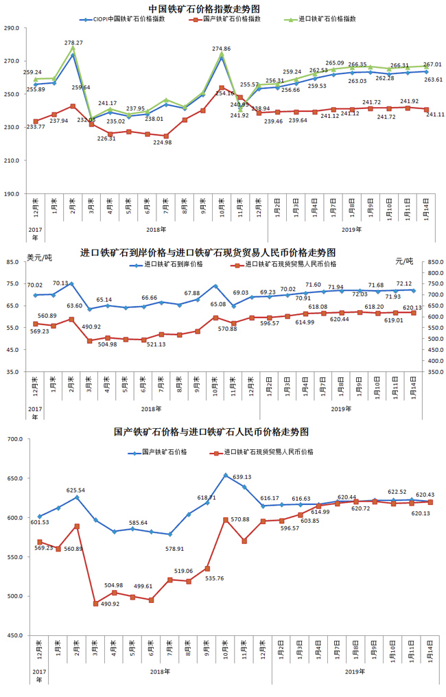 1月14日,中國鐵礦石價格指數(shù)(CIOPI)263.61點,環(huán)比上升0.50點,升幅為0.19%。其中:國產(chǎn)鐵礦石價格指數(shù)為241.11點,環(huán)比下降0.81點,降幅為0.34%;進口鐵礦石價格指數(shù)為267.01點,環(huán)比上升0.70點,升幅為0.26%。