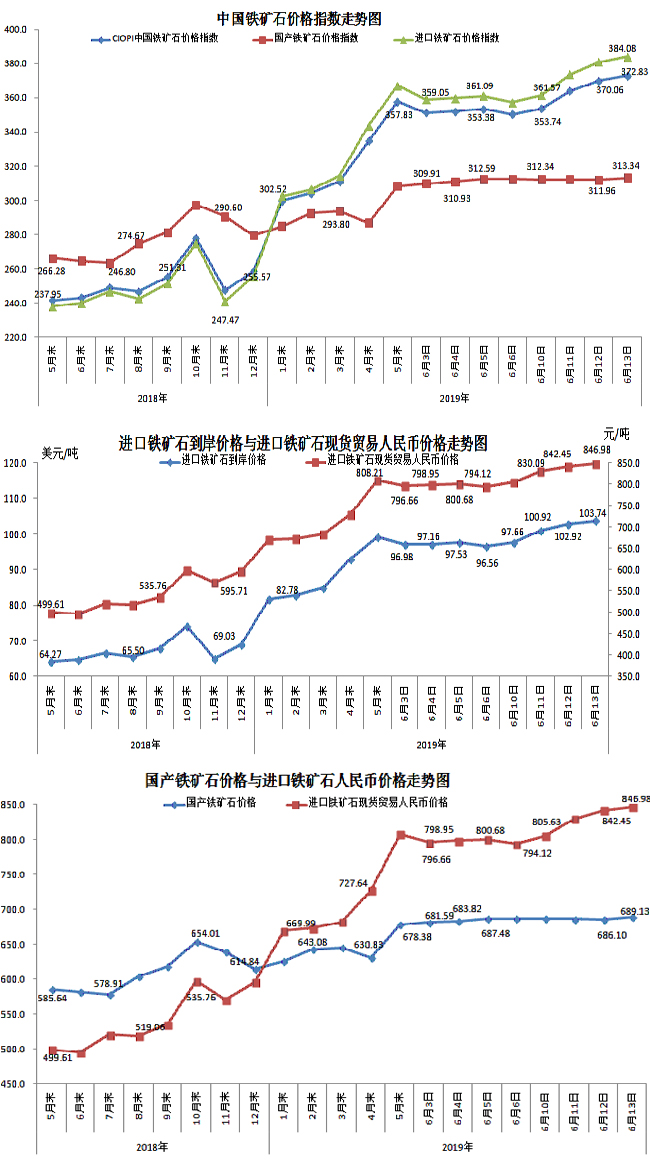 6月13日,中國鐵礦石價格指數(CIOPI)372.83點,環比上升2.77點,升幅為0.75%。其中:國產鐵礦石價格指數為313.34點,環比上升1.38點,升幅為0.44%;進口鐵礦石價格指數為384.08點,環比上升3.04點,升幅為0.80%。