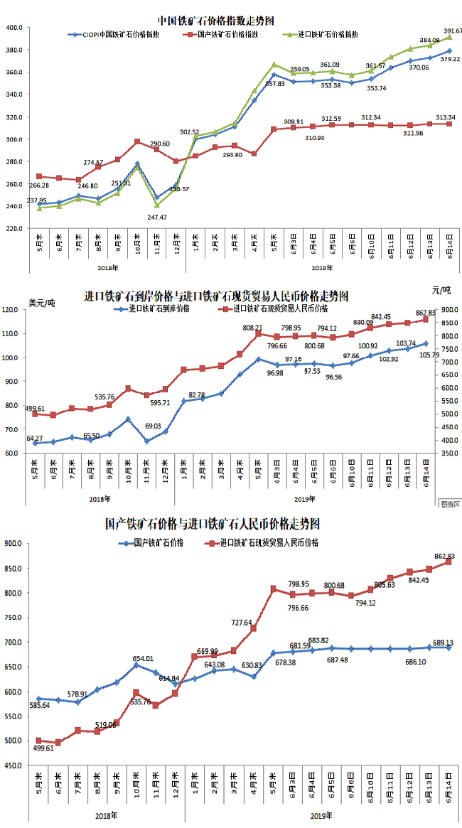 6月14日,中國鐵礦石價格指數(CIOPI)379.22點,環比上升6.38點,升幅為1.71%。其中:國產鐵礦石價格指數為313.34點,環比持平;進口鐵礦石價格指數為391.67點,環比上升7.59點,升幅為1.98%。