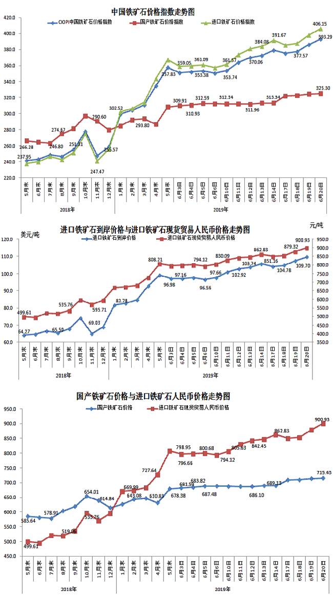 6月20日,中國鐵礦石價格指數(CIOPI)393.29點,環比上升6.96點,升幅為1.80%。其中:國產鐵礦石價格指數為325.30點,環比上升0.68點,升幅為0.21%;進口鐵礦石價格指數為406.15點,環比上升8.15點,升幅為2.05%。
