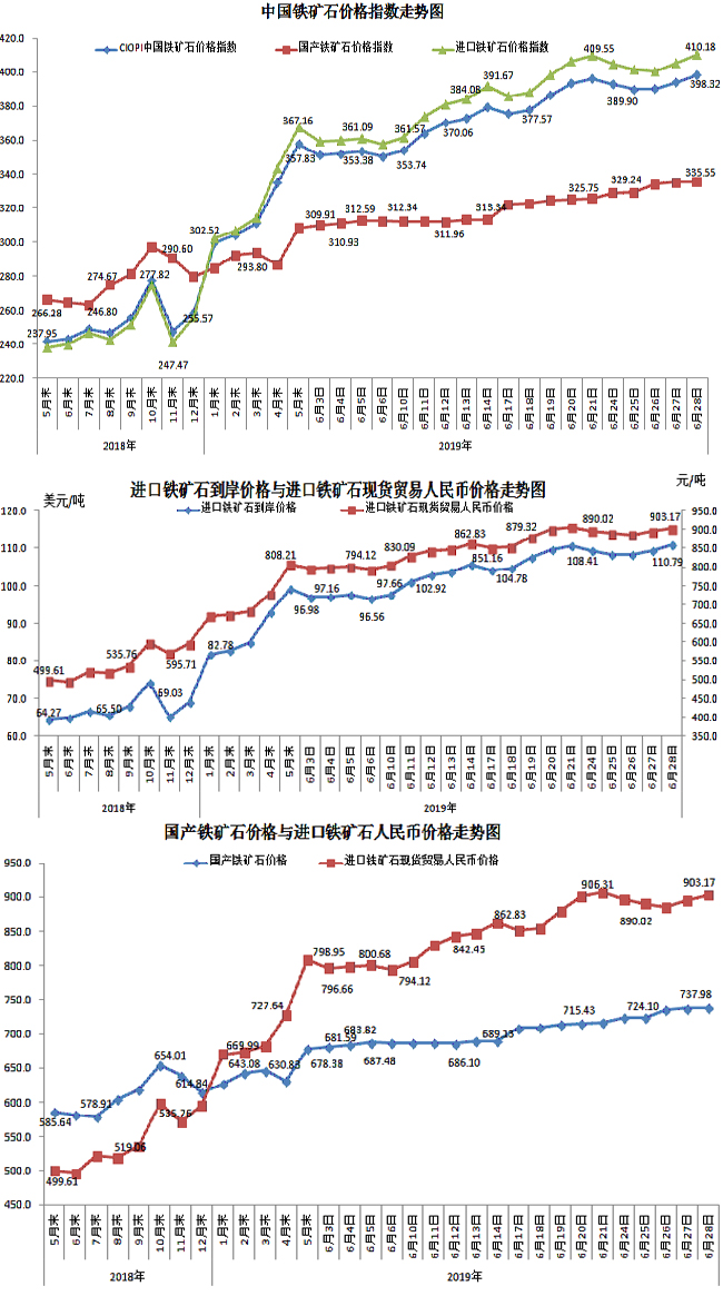 6月28日,中國(guó)鐵礦石價(jià)格指數(shù)(CIOPI)398.32點(diǎn),環(huán)比上升4.35點(diǎn),升幅為1.11%。其中:國(guó)產(chǎn)鐵礦石價(jià)格指數(shù)為335.55點(diǎn),環(huán)比上升0.36點(diǎn),升幅為0.11%;進(jìn)口鐵礦石價(jià)格指數(shù)為410.18點(diǎn),環(huán)比上升5.11點(diǎn),升幅為1.26%。