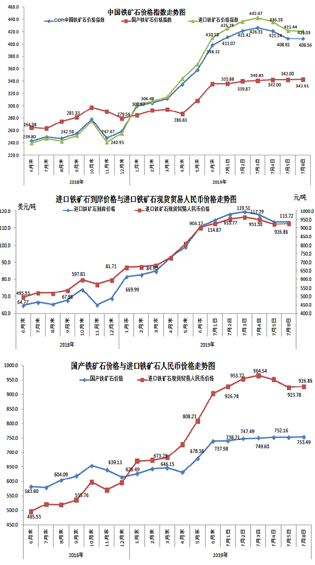 7月8日,國產鐵礦石62%品位干基鐵精礦含稅價格為753.49元/噸,環比每噸上升1.33元,升幅為0.18%;比進口鐵礦石低173.37元/噸,降幅為18.70%;當月平均價格為748.94元/噸,比進口鐵礦石低192.23元/噸,降幅為20.42%。
