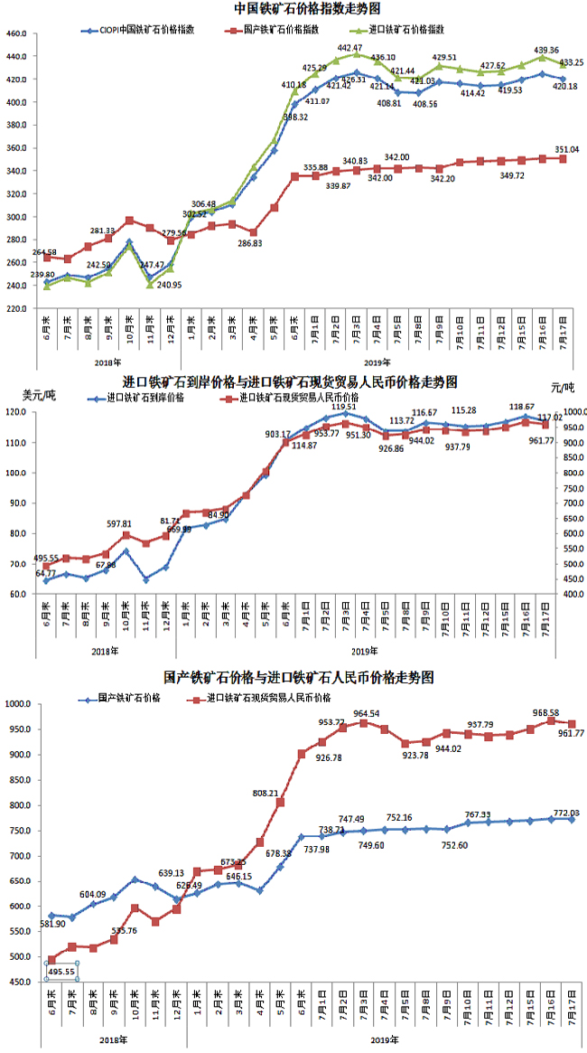7月17日,中國鐵礦石價格指數(CIOPI)420.18點,環比下降5.14點,降幅為1.21%。其中:國產鐵礦石價格指數為351.04點,環比持平;進口鐵礦石價格指數為433.25點,環比下降6.11點,降幅為1.39%。