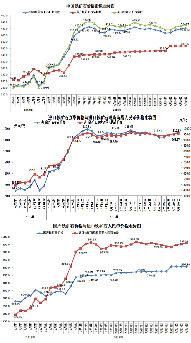 7月30日,中國鐵礦石價格指數(shù)(CIOPI)422.48點,環(huán)比上升3.84點,升幅為0.91%。其中:國產(chǎn)鐵礦石價格指數(shù)為367.32點,環(huán)比下降0.55點,降幅為0.15%;進口鐵礦石價格指數(shù)為432.91點,環(huán)比上升4.63點,升幅為1.08%。