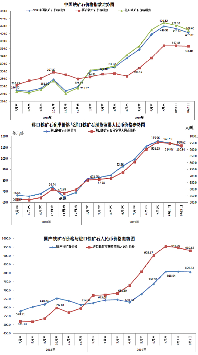 8月2日,中國鐵礦石價格指數(CIOPI)402.82點,環比下降10.84點,降幅為2.62%。其中:國產鐵礦石價格指數為366.81點,環比下降1.02點,降幅為0.28%;進口鐵礦石價格指數為409.63點,環比下降12.70點,降幅為3.01%。