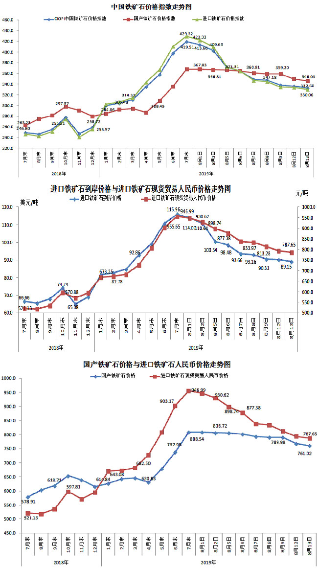 8月13日,中國鐵礦石價(jià)格指數(shù)(CIOPI)332.60點(diǎn),環(huán)比下降3.54點(diǎn),降幅為1.05%。其中:國產(chǎn)鐵礦石價(jià)格指數(shù)為346.03點(diǎn),環(huán)比下降3.44點(diǎn),降幅為0.98%;進(jìn)口鐵礦石價(jià)格指數(shù)為330.06點(diǎn),環(huán)比下降3.55點(diǎn),降幅為1.07%。