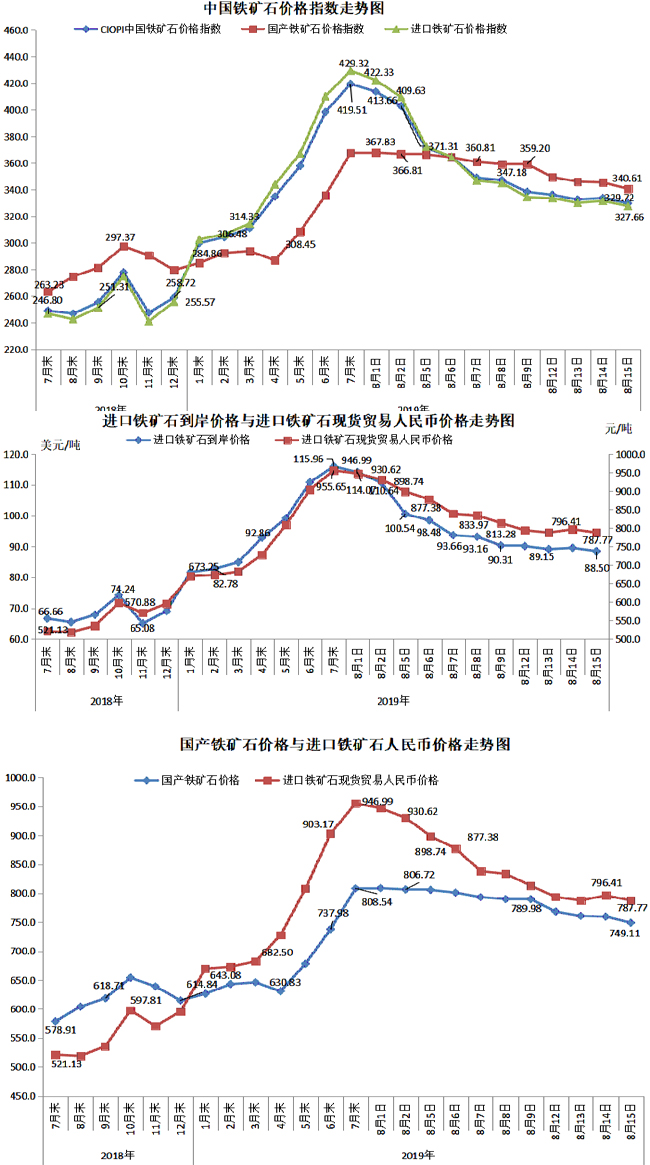 8月15日,中國鐵礦石價格指數(CIOPI)329.72點,環比下降4.04點,降幅為1.21%。其中:國產鐵礦石價格指數為340.61點,環比下降4.84點,降幅為1.40%;進口鐵礦石價格指數為327.66點,環比下降3.89點,降幅為1.17%。