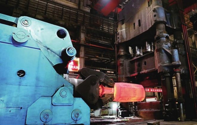 2018年底,3000kN/7500kNm大型鍛造操作機按期交付。在二重裝備車間,操作機穩定夾持數百噸1000℃以上高溫鍛坯進行六維精準送進,顯著提高了鍛造生產效率與材料利用率、減少了鍛造火次、降低了能耗,鍛件質量也得以大幅提高。二重裝備有了3000kN/7500kNm大型鍛造操作機的助力,極限鍛造能力大大提升,開創了高品質鍛件綠色化、數字化、優質高效鍛造生產的新局面,形成了大型鍛件高端化、規?;O限化制造的強大優勢。2021年,二重裝備鍛造量突破8萬噸,實現了核電主管道、超超臨界新產品項目鍛件、燃機項目轉子鍛件的“精品鍛造”,形成了以“華龍一號”為代表的第三代核電機型全套鑄鍛件、百萬千瓦級超超臨界機組關鍵成套大鍛件等為代表的極限制造體系,譜寫了新時代大型鍛件生產新篇章。