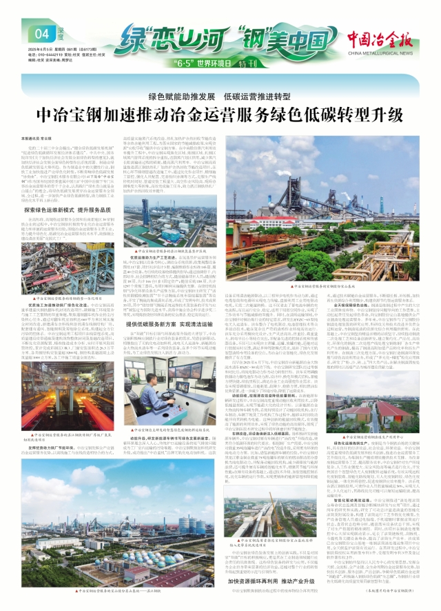黨的二十屆三中全會提出:“健全綠色低碳發展機制”“促進綠色低碳循環發展經濟體系建設”。中共中央、國務院印發《關于加快經濟社會發展全面綠色轉型的意見》,就加快經濟社會發展全面綠色轉型作出系統部署。制造業綠色低碳發展是大勢所趨。作為制造業中的關鍵性行業,鋼鐵工業加快推進產業綠色化轉型,不斷奏響綠色低碳發展“協奏曲”。中冶寶鋼技術服務有限公司(以下簡稱“中冶寶鋼”)作為國務院國資委直屬中國五礦中國中冶旗下專門從事冶金運營服務的骨干子企業,認真踐行“綠水青山就是金山銀山”的理念,將綠色低碳發展貫穿冶金運營服務全領域、全過程,進一步加快產業綠色低碳轉型,助力鋼鐵工業綠色化水平再上新臺階。