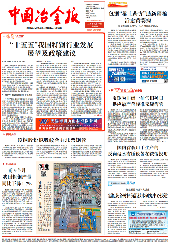 “十五五”即將開啟,特鋼行業(yè)肩負(fù)重任、前景光明。特鋼行業(yè)要積極借鑒國外先進經(jīng)驗,緊密結(jié)合自身發(fā)展實際,扎實落實發(fā)展思路和各項重點任務(wù)。特鋼企業(yè)要找準(zhǔn)定位,走專精特新發(fā)展之路,緊緊抓住高端化、專業(yè)化、綠色化、智能化、國際化發(fā)展主線,堅定不移地推進科技創(chuàng)新、優(yōu)化產(chǎn)業(yè)結(jié)構(gòu),書寫特鋼行業(yè)高質(zhì)量發(fā)展的新篇章。(王文金 劉建軍 趙發(fā)忠 管志杰 趙佳)