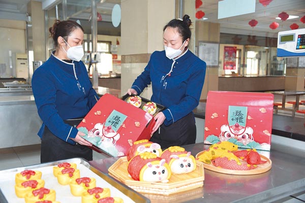 圖為張宣科技行政服務(wù)中心職工正在將產(chǎn)品裝進(jìn)花饃禮盒。 (孫琦 攝)
