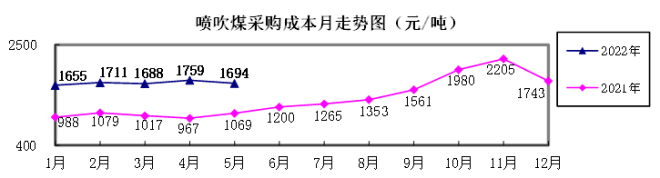 噴吹煤5月份加權平均折算成干基的采購成本為1693.75元/噸,環比下降65.72元/噸,降幅為3.74%。1-5月累計平均折算成干基的采購成本為1678.70元/噸,同比升高654.37元/噸,升幅為63.88%。
