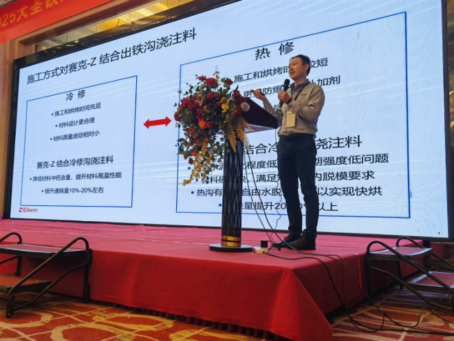 埃肯國際貿(mào)易(上海)技術(shù)經(jīng)理戴長浩在《微硅粉及無水泥結(jié)合劑在出鐵溝澆注料中的應(yīng)用》報告中,闡述新型材料在出鐵溝澆注料中的應(yīng)用優(yōu)勢。