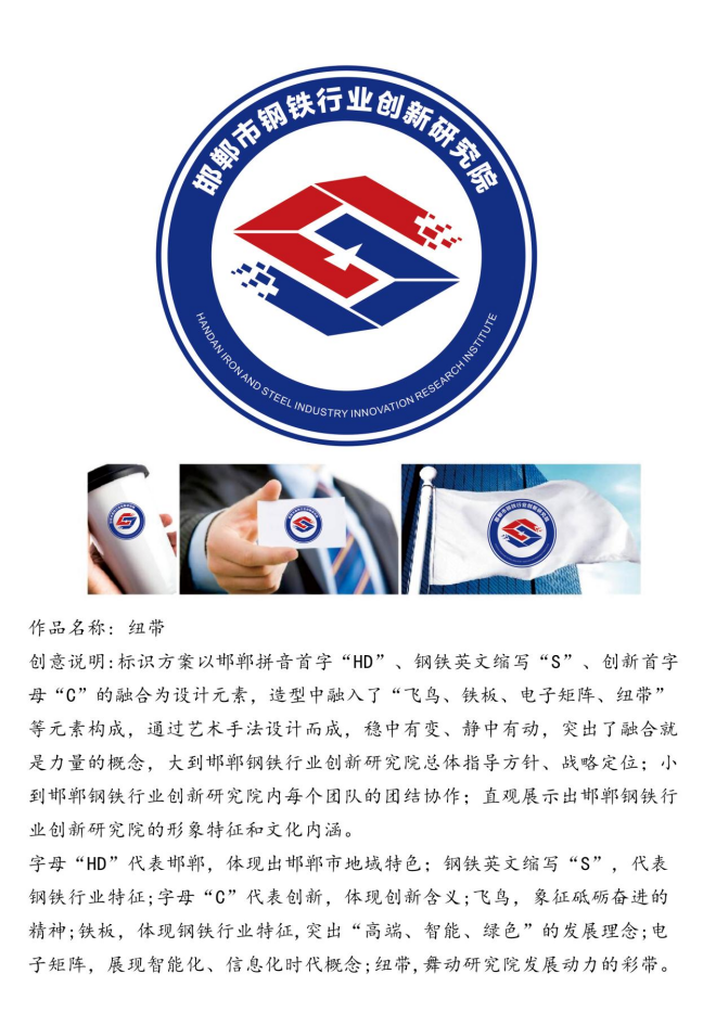 創意說明:中間的H代表古都邯鄲,H周圍的圖案取自戰國時期青銅器紋樣代表冶金歷史悠久。顏色用綠色和藍色表示,代表了邯鄲市鋼鐵行業創新研究院的理念,綠色化,高端化,智能化。