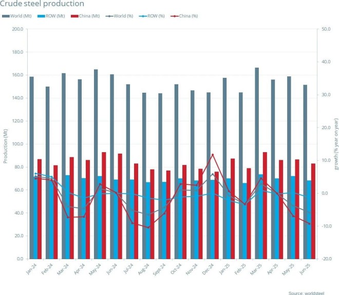 2025年6月全球70個納入世界鋼鐵協會統計國家/地區的粗鋼產量為1.514億噸,同比下降5.8%。