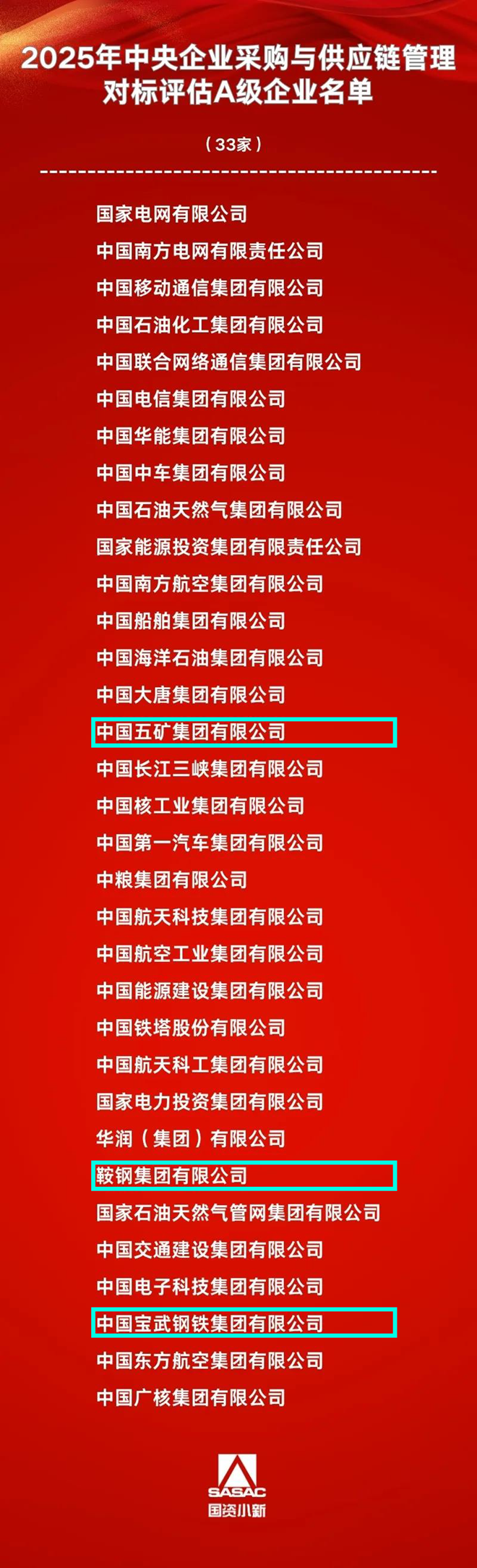 近期,國務(wù)院國資委組織完成2025年中央企業(yè)采購與供應(yīng)鏈管理對標(biāo)評估工作。經(jīng)審定,共包含A級企業(yè)33家,其中包括3家鋼鐵相關(guān)企業(yè),具體如下: