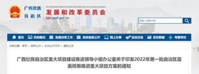 近日,廣西壯族自治區(qū)發(fā)展和改革委員會(huì)網(wǎng)站發(fā)布了《廣西壯族自治區(qū)重大項(xiàng)目建設(shè)推進(jìn)領(lǐng)導(dǎo)小組辦公室印發(fā)2022年第一批自治區(qū)層面統(tǒng)籌推進(jìn)重大項(xiàng)目方案的通知》。據(jù)統(tǒng)計(jì),共涉及1996個(gè)項(xiàng)目,總投資37826.2億元,年度計(jì)劃投資4007.9億元。其中,新開(kāi)工項(xiàng)目190個(gè),總投資3447.8億元,年度計(jì)劃投資282.8億元。